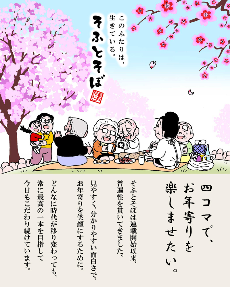 仲むつまじい老夫婦の日常をユーモアたっぷりに描いた「そふとそぼ」は、全国60%の介護事業所で高齢者の皆様にお楽しみ頂いている4コマ漫画です。 高齢の田中徳男と妻・春子が主人公。ほのぼのとした日々の暮らしをはじめ、認知症や終活、入院生活などさまざまなテーマを取り上げています。